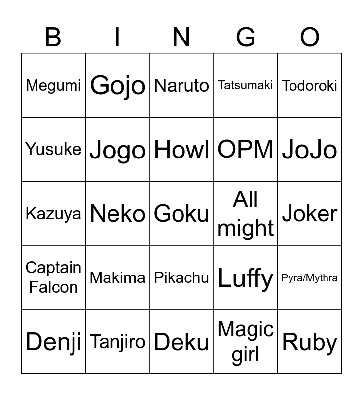 This bingo card has a free space and 24 words: Denji, Makima, Howl, Magic girl, Todoroki, Megumi, Gojo, Naruto, All might, Joker, Kazuya, Jogo, Luffy, Pyra/Mythra, Yusuke, Tanjiro, Deku, Tatsumaki, JoJo, Captain Falcon, Neko, Pikachu, OPM and Ruby.