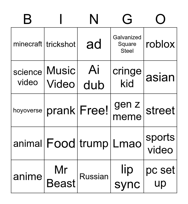 This bingo card has a free space and 24 words: Food, Mr Beast, Ai dub, anime, roblox, minecraft, science video, trickshot, gen z meme, trump, cringe kid, hoyoverse, Lmao, sports video, Music Video, lip sync, street, ad, asian, prank, pc set up, animal, Galvanized Square Steel and Russian.