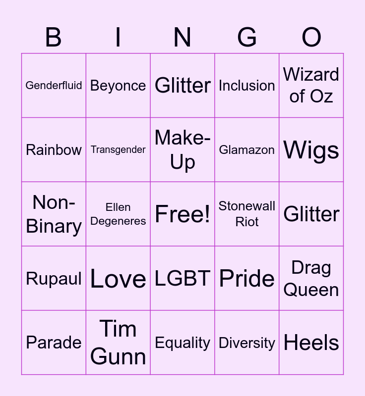 This bingo card has a free space and 24 words: Parade, Love, Make-Up, Diversity, Wizard of Oz, Genderfluid, Beyonce, Glitter, Stonewall Riot, Glitter, Non-Binary, Transgender, Pride, Drag Queen, Rainbow, Tim Gunn, Equality, Inclusion, Wigs, Rupaul, Ellen Degeneres, LGBT, Glamazon and Heels.