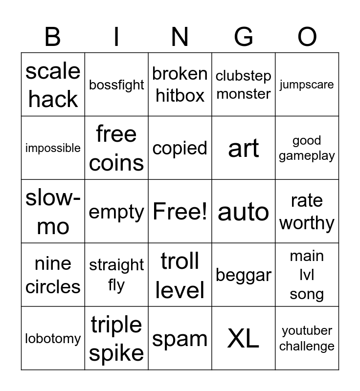 This bingo card has a free space and 24 words: straight fly, triple spike, copied, lobotomy, jumpscare, scale hack, impossible, bossfight, auto, troll level, art, slow-mo, beggar, main lvl song, free coins, XL, rate worthy, broken hitbox, good gameplay, empty, youtuber challenge, nine circles, clubstep monster and spam.