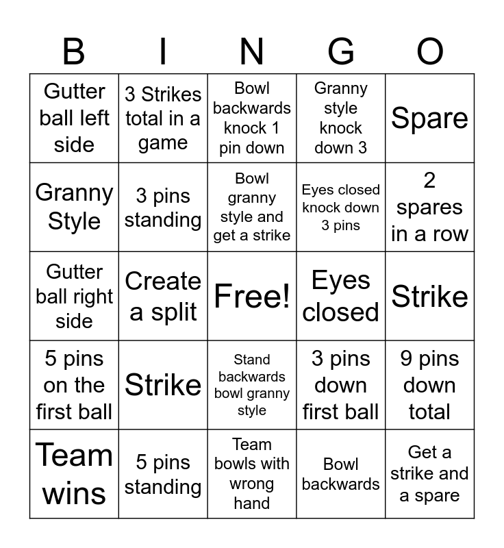 This bingo card has a free space and 25 words: Strike, Team bowls with wrong hand, Bowl granny style and get a strike, Team wins, Spare, Gutter ball left side, Granny Style, 3 Strikes total in a game, Eyes closed, Stand backwards bowl granny style, Eyes closed knock down 3 pins, Gutter ball right side, 3 pins down first ball, 9 pins down total, 3 pins standing, 7 pins down on first ball, Strike, Bowl backwards knock 1 pin down, 2 spares in a row, Create a split, Get a strike and a spare, 5 pins standing, 5 pins on the first ball, Granny style knock down 3 and Bowl backwards.