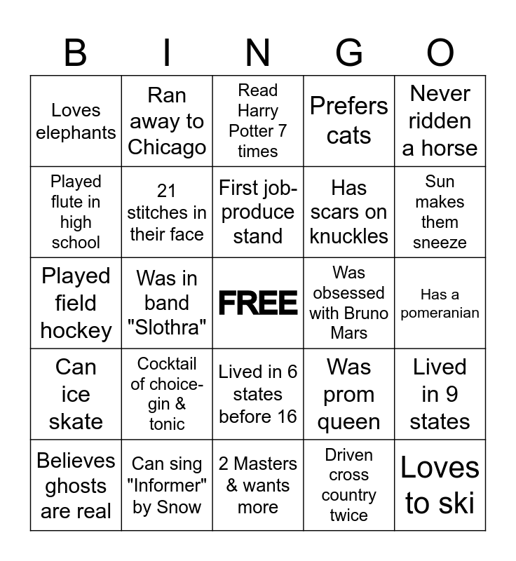This bingo card has a free space and 24 words: Cocktail of choice- gin & tonic, Can sing "Informer" by Snow, First job- produce stand, Believes ghosts are real, Never ridden a horse, Loves elephants, Played flute in high school, Ran away to Chicago, Was obsessed with Bruno Mars, Lived in 6 states before 16, Has scars on knuckles, Played field hockey, Was prom queen, Lived in 9 states, 21 stitches in their face, Driven cross country twice, Has a pomeranian, Read Harry Potter 7 times, Sun makes them sneeze, Was in band "Slothra", Loves to ski, Can ice skate, Prefers cats and 2 Masters & wants more.