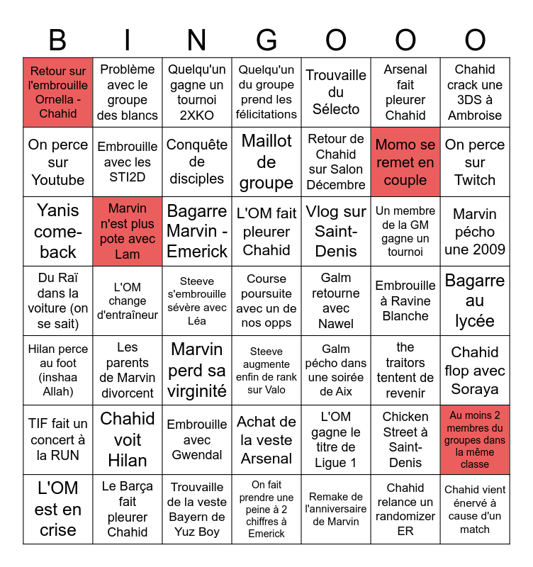 This bingo card has a free space and 48 words: L'OM gagne le titre de Ligue 1, Momo se remet en couple, On fait prendre une peine à 2 chiffres à Emerick, L'OM change d'entraîneur, Bagarre Marvin - Emerick, Bagarre au lycée, Problème avec le groupe des blancs, Le Barça fait pleurer Chahid, Arsenal fait pleurer Chahid, Steeve augmente enfin de rank sur Valo, Chahid crack une 3DS à Ambroise, Quelqu'un du groupe prend les félicitations, Un membre de la GM gagne un tournoi, Vlog sur Saint-Denis, TIF fait un concert à la RUN, Embrouille à Ravine Blanche, On perce sur Youtube, On perce sur Twitch, Chicken Street à Saint-Denis, Trouvaille du Sélecto, Retour de Chahid sur Salon Décembre, Steeve s'embrouille sévère avec Léa, Retour sur l'embrouille Ornella - Chahid, Embrouille avec les STI2D, Au moins 2 membres du groupes dans la même classe, Conquête de disciples, Marvin pécho une 2009, L'OM est en crise, L'OM fait pleurer Chahid, Marvin n'est plus pote avec Lam, Chahid relance un randomizer ER, Galm retourne avec Nawel, Chahid flop avec Soraya, Chahid voit Hilan, Du Raï dans la voiture (on se sait), Galm pécho dans une soirée de Aix, the traitors tentent de revenir, Yanis come-back, Marvin perd sa virginité, Embrouille avec Gwendal, Hilan perce au foot (inshaa Allah), Chahid vient énervé à cause d'un match, Quelqu'un gagne un tournoi 2XKO, Trouvaille de la veste Bayern de Yuz Boy, Maillot de groupe, Achat de la veste Arsenal, Les parents de Marvin divorcent and Remake de l'anniversaire de Marvin.