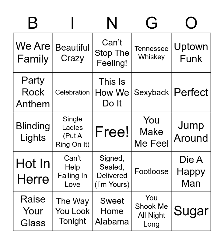 This bingo card has a free space and 105 words: September, Sweet Caroline, Uptown Funk, Yeah!, Shut Up And Dance, Don’t Stop Believin’, Mr. Brightside, Dancing Queen, Cupid Shuffle, I Gotta Feeling, Cha Cha Slide, Low, Livin’ On A Prayer, Wannabe, Hey Ya!, Wobble, Can’t Stop The Feeling!, Friends In Low Places, Crazy In Love, Party In The U.S.A., Get Low, Everybody (Backstreet’s Back), 24k Magic, Marry You, Brown Eyed Girl, Can’t Help Falling In Love, Perfect, Tennessee Whiskey, Despacito, Love Shack, Footloose, You Shook Me All Night Long, Dancing In The Moonlight, We Found Love, Come On Eileen, Man! I Feel Like A Woman!, Levitating, Shake It Off, This Is How We Do It, The Way You Look Tonight, Twist And Shout, Hot In Herre, Forever, Party Rock Anthem, My Girl, We Are Family, Thinking Out Loud, Sugar, Timber, I Like It, Baby Got Back, Bye Bye Bye, Africa, Wagon Wheel, All Of Me, You Make My Dreams (Come True), Pour Some Sugar On Me, Danza Kuduro, Girls Just Want To Have Fun, Signed, Sealed, Delivered (I’m Yours), Jump Around, Bohemian Rhapsody, I Want It That Way, Truth Hurts, Mambo No. 5 (A Little Bit Of..), Shout, Better Together, Beautiful Crazy, Blinding Lights, Single Ladies (Put A Ring On It), Sweet Home Alabama, Ain’t No Mountain High Enough, Happy, Y.M.C.A., Love On Top, Summer Of ’69, Billie Jean, Dynamite, Raise Your Glass, Fireball, Play That Funky Music, Stand By Me, Hips Don’t Lie, Celebration, Higher Love, You Make Me Feel, Cotton Eye Joe, Don’t Stop Me Now, Ignition (Remix), Turn Down For What, Chicken Fried, At Last, This Will Be (An Everlasting Love), Old Town Road (Remix), Die A Happy Man, Build Me Up Buttercup, Gold Digger, Stayin’ Alive, Sexyback, Just Dance, Wonderful Tonight, (I’ve Had The) Time Of My Life, Time Of Our Lives, Give Me Everything and Dj Got Us Fallin’ In Love.
