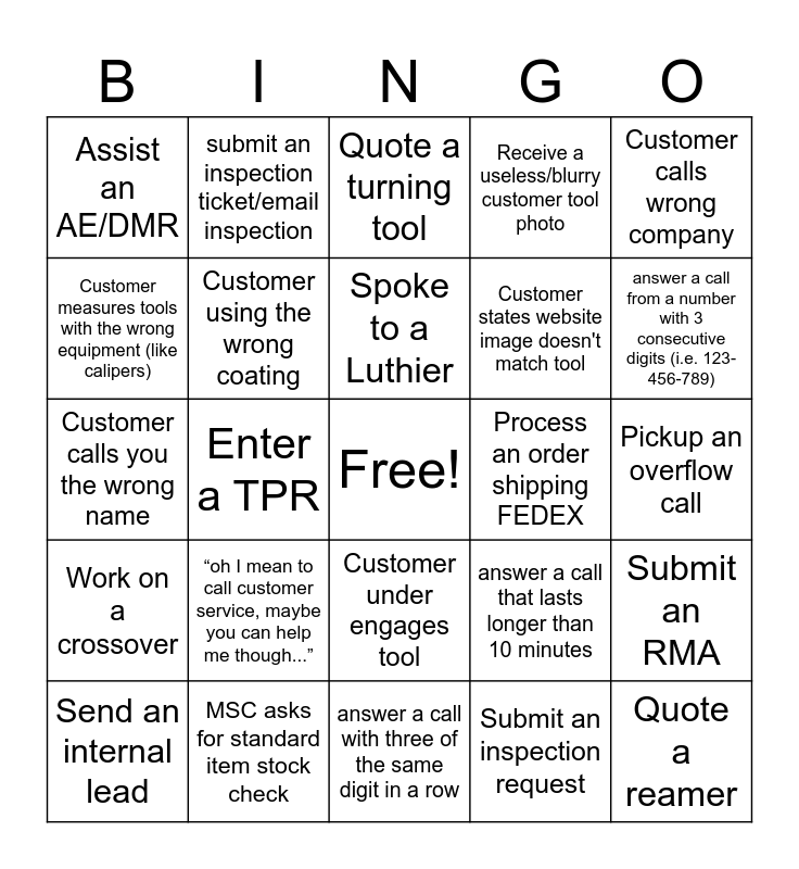 This bingo card has a free space and 40 words: Customer didn't introduce themselves, Customer calls you the wrong name, Customer asks for S&F, doesn't provide full info, Customer using the wrong coating, MSC asks for standard item stock check, Customer under engages tool, Spoke to a Luthier, AE request for multiple brands, Customer calls wrong company, Work on a crossover, Enter a TPR, Receive a useless/blurry customer tool photo, Quote a reamer, Pickup an overflow call, Process an order shipping FEDEX, “oh I mean to call customer service, maybe you can help me though...”, Help CS with order entry, Assist an AE/DMR, Quote a tool over 5 flutes, Quote a turning tool, Submit an RMA, Submit an inspection request, Customer states website image doesn't match tool, Customer measures tools with the wrong equipment (like calipers), Quote for an international customer, Customer changes what they want as soon as you quote them, Customer is trying to machine something that has multiple materials, Someone is looking for a spline tool, Process a blanket order, Quote a coated standard, Refer a customer to a different brand, Send an internal lead, create or request from engineering a new custom Tool print, answer a call that lasts longer than 10 minutes, answer a call from a number with 3 consecutive digits (i.e. 123-456-789), answer a call with three of the same digit in a row, Quote any international customer, reach out to an application engineer for help, submit an inspection ticket/email inspection and receive a thank you email from a customer/distributor.