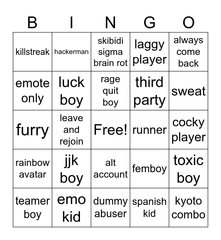 This bingo card has a free space and 24 words: teamer boy, jjk boy, rage quit boy, spanish kid, always come back, killstreak, hackerman, skibidi sigma brain rot, runner, cocky player, furry, luck boy, femboy, toxic boy, emote only, emo kid, dummy abuser, laggy player, sweat, rainbow avatar, leave and rejoin, alt account, third party and kyoto combo.