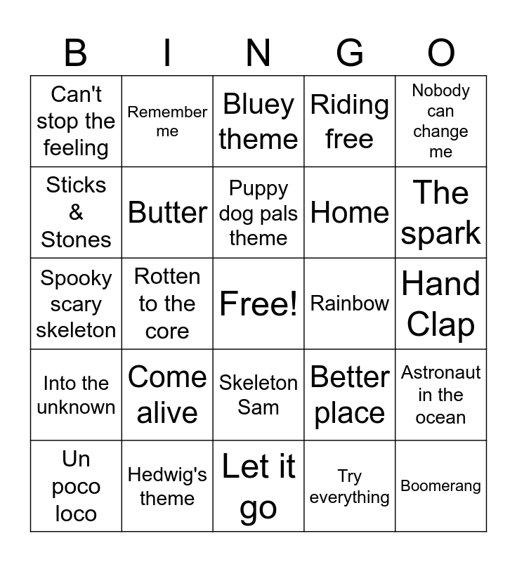 This bingo card has a free space and 37 words: We don't talk about Bruno, Good feeling, Surface pressure, Butter, Astronaut in the ocean, Come alive, Puppy dog pals theme, Hello we're the Squishmallows, Nobody can change me, Shake it off, Rotten to the core, Riding free, Boomerang, Hand Clap, Sticks & Stones, Into the unknown, A sky full of stars, Bluey theme, Skeleton Sam, Rainbow, Can't stop the feeling, The spark, Un poco loco, Let it go, Do you want to build a snowman, Try everything, Remember me, You're welcome, Happy, Firework, 22, Hedwig's theme, Spooky scary skeleton, The family Madrigal, Better place, Home and Welcome to New York.