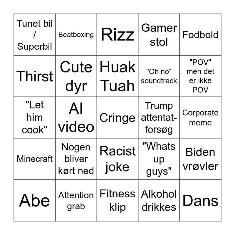 This bingo card has a free space and 24 words: Nogen bliver kørt ned, Attention grab, Huak Tuah, Abe, Fodbold, Tunet bil / Superbil, Thirst, Beatboxing, Trump attentat- forsøg, Racist joke, "Oh no" soundtrack, "Let him cook", "Whats up guys", Biden vrøvler, Cute dyr, Alkohol drikkes, Corporate meme, Rizz, "POV" men det er ikke POV, AI video, Dans, Minecraft, Gamer stol and Fitness klip.