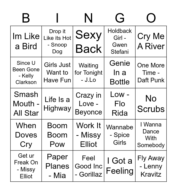 This bingo card has a free space and 44 words: Since You Been Gone, Fly Away - Lenny Kravitz, YEAH - Usher, Get ur Freak On - Missy Elliot, Ms Jackson - Outkast, I Got a Feeling, Sexy Back, Stronger -Kanye West, Cry Me A River, Paper Planes - Mia, Holdback Girl - Gwen Stefani, Low - Flo Rida, Work It - Missy Elliot, Boom Boom Pow, Rehab - Amy Winehouse, Feel Good Inc - Gorillaz, Get the Party Started - P!nk, Smash Mouth - All Star, Last Night - The Strokes, One More Time - Daft Punk, Drop it Like its Hot - Snoop Dog, Mr. Brightside - The Killers, Fallin' - Alicia Keys, Im Like a Bird, Bye, Bye, Bye, No Scrubs, Livin' La Vida Loca, I Want It That Way, Wannabe - Spice Girls, When Doves Cry, Believe - Cher, I Wanna Dance With Somebody, Shake It Off - Taylor Swift, Billie Jean - MJ, Life Is a Highway, Oops I Did It Again, Who Let the Dogs Out, All The Small Things - Blink 182, Waiting for Tonight - J.Lo, Since U Been Gone - Kelly Clarkson, Genie In a Bottle, Just The Way You Are - Bruno Mars, Girls Just Want to Have Fun and Man, I Feel Like a Woman.