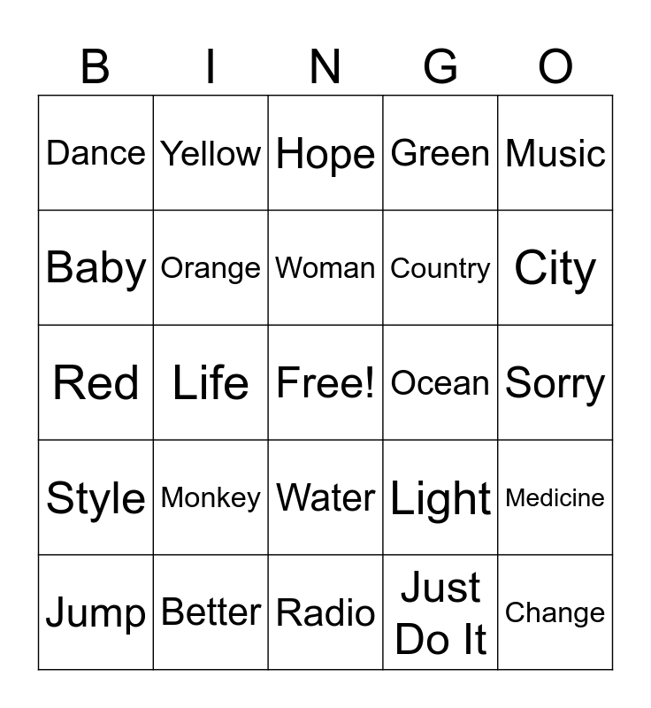 This bingo card has a free space and 76 words: Never, Give, Hope, Happy, Sad, Together, Shake, Sing, Party, Boy, Girl, Man, Woman, Baby, Dream, Life, Mirror, Change, Face, Music, Dance, Red, Orange, Yellow, Green, Blue, Purple, Pink, Black, White, Night, Day, Dark, Light, City, Country, Road, Highway, Sorry, Just Do It, It's Not Your Fault, John, Momma, Daddy, Down, Up, Jump, Dance, Slide, Feet, Lightning, Water, Rock, Love, Heart, Wish, Want, Monster, Dog, Cat, Monkey, Lion, Snake, Snow, Rain, River, Ocean, Wave, Mountain, Poison, Medicine, Style, Better, Car, Radio and TV.