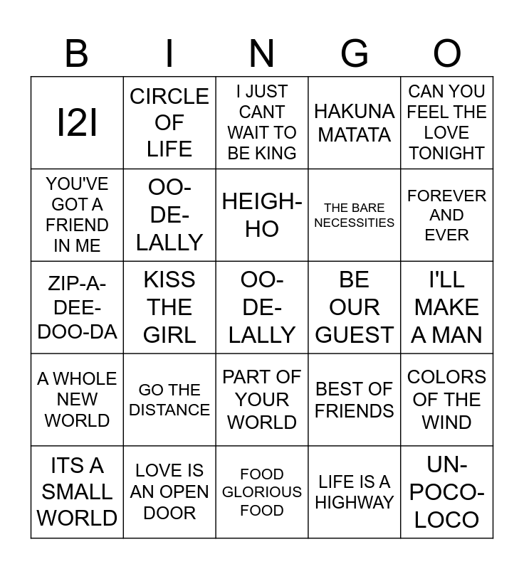 This bingo card has 40 words: A FRIEND LIKE ME, ZIP-A-DEE-DOO-DA, YOU'LL BE IN MY HEART, OO-DE-LALLY, LOVE IS AN OPEN DOOR, PART OF YOUR WORLD, HEIGH-HO, PRICE ALI, CAN YOU FEEL THE LOVE TONIGHT, A WHOLE NEW WORLD, KISS THE GIRL, HAKUNA MATATA, OO-DE-LALLY, I'LL MAKE A MAN, BE OUR GUEST, GO THE DISTANCE, UNDER THE SEA, I2I, ARABIAN NIGHTS, I JUST CANT WAIT TO BE KING, COLORS OF THE WIND, LIFE IS A HIGHWAY, THE BARE NECESSITIES, YOU'VE GOT A FRIEND IN ME, WE DONT TALK ABOUT BRUNO, LITTLE DRESS MAKERS, WHISTLE WHILE YOU WORK, HOW FAR I'LL GO, UN-POCO-LOCO, COLORS OF THE WIND, A SPOON FULL OF SUGAR, ITS A SMALL WORLD, YOU CAN FLY!, BEST OF FRIENDS, FOREVER AND EVER, FOOD GLORIOUS FOOD, I'M A BELIEVER, HOW FAR I'LL GO, CIRCLE OF LIFE and CRUELLA DE-VILLE.