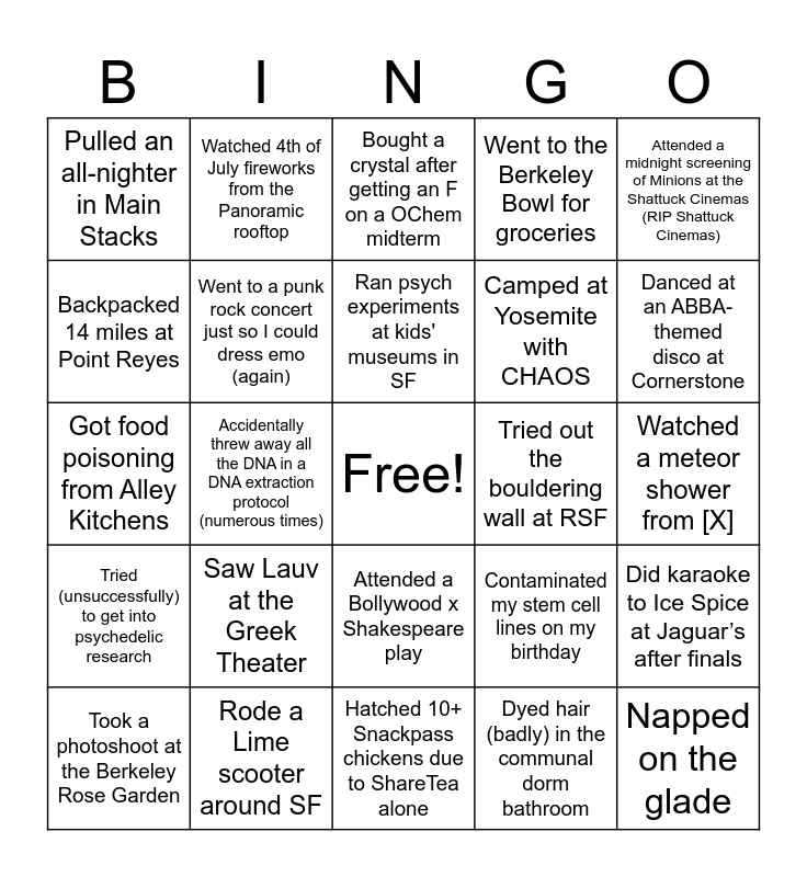 This bingo card has a free space and 44 words: Ate a caprese panini at FSM (3x a week for three years), Napped on the glade, Got robbed while roller skating at Lower Sproul, Took a photoshoot at the Berkeley Rose Garden, Rode the F bus to San Francisco, Dyed hair (badly) in the communal dorm bathroom, Bought a crystal after getting an F on a OChem midterm, Dissected a mouse in Bio 1AL, Attended a midnight screening of Minions at the Shattuck Cinemas (RIP Shattuck Cinemas), Rode a Lime scooter around SF, Went to the Berkeley Bowl for groceries, Tried out the bouldering wall at RSF, Attended a Bollywood x Shakespeare play, Saw Lauv at the Greek Theater, Finessed free donuts at King Pin’s, Hatched 10+ Snackpass chickens due to ShareTea alone, Had an (exceptional) Volcano Bingsoo at U Dessert Story, Got food poisoning from Alley Kitchens, Killed four succulents in a row, bought from the street booth outside TPTea, Danced at an ABBA-themed disco at Cornerstone, Watched 4th of July fireworks from the Panoramic rooftop, Inquired at 3+ places for a nose piercing I never ended up getting, Stood on top of a trash can for over an hour to avoid getting trampled by the mob trying to break into the free Soulja Boy concert, Pulled an all-nighter in Main Stacks, Took a oral exam (??) for a data science / programming class, Watched a meteor shower from [X], Ended up with a Nicki Minaj-themed apartment because each of my roommates mistakenly believed that the others were Barbs, but none of us actually were, Wished on my apartment’s Nicki Minaj candle to get into grad school, Contaminated my stem cell lines on my birthday, Tried (unsuccessfully) to get into psychedelic research, Added an MCB major because of Dr. David Presti (the GOAT), Did karaoke to Ice Spice at Jaguar’s after finals, Post-yacht party In-N-Out (x2), Developed GERD, Accidentally threw away all the DNA in a DNA extraction protocol (numerous times), Became addicted to Utah soda shops during my senior trip, Crashed my ATV during spring break, Crashed my car after spring break, Ran psych experiments at kids' museums in SF, Backpacked 14 miles at Point Reyes, Camped at Yosemite with CHAOS, Wrote about cults & psychotropic drugs for Neurotech, Went to a punk rock concert just so I could dress emo (again) and Worked with snake viruses.