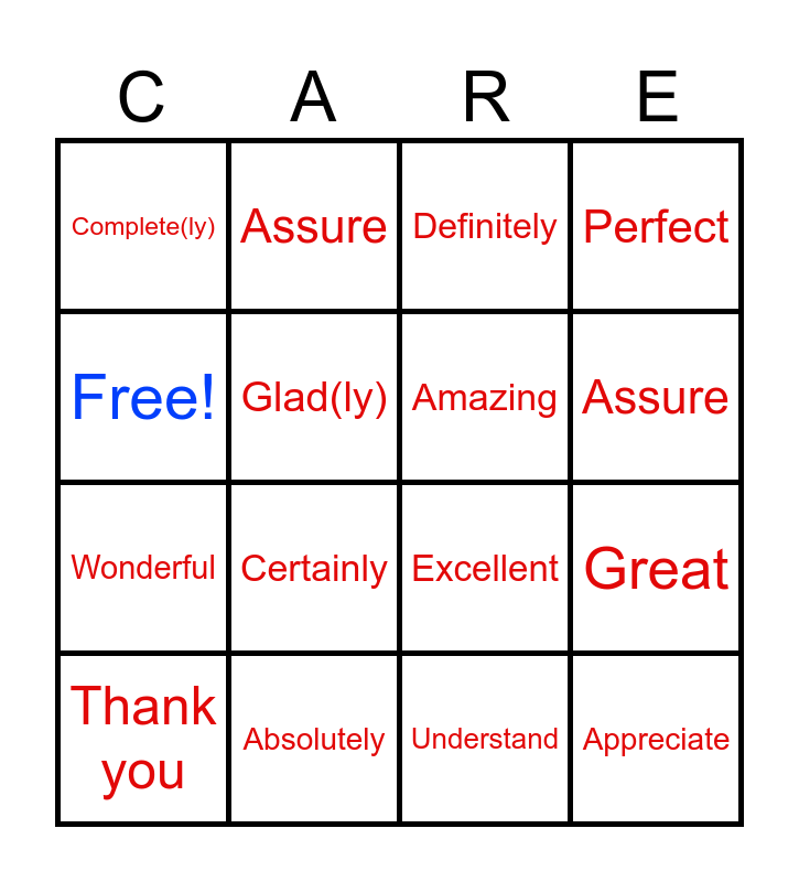 This bingo card has 1 images and 16 words: Thank you, Absolutely, Definitely, Perfect, Wonderful, Glad(ly), Excellent, Assure, Free!, Certainly, Understand, Great, Complete(ly), Assure, Amazing and Appreciate.
