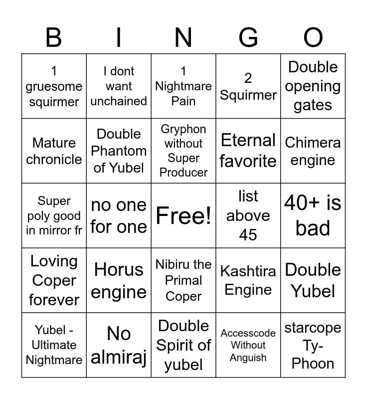 This bingo card has a free space and 29 words: Yubel - Ultimate Nightmare, Grind Golem, no one for one, HAMON LORD OF THUNDAAA, 1 gruesome squirmer, 1 Nightmare Pain, Double Phantom of Yubel, Horus engine, list above 45, No almiraj, 40+ is bad, starcope Ty-Phoon, Double Spirit of yubel, Accesscode Without Anguish, Chimera engine, Chaos Core, Nibiru the Primal Coper, Loving Coper forever, Double opening gates, Super poly good in mirror fr, Kashtira Engine, Chamber of the unchained, Eternal favorite, Mature chronicle, 2 Squirmer, I dont want unchained, Double Yubel, Gryphon without Super Producer and Abomination (easter egg).