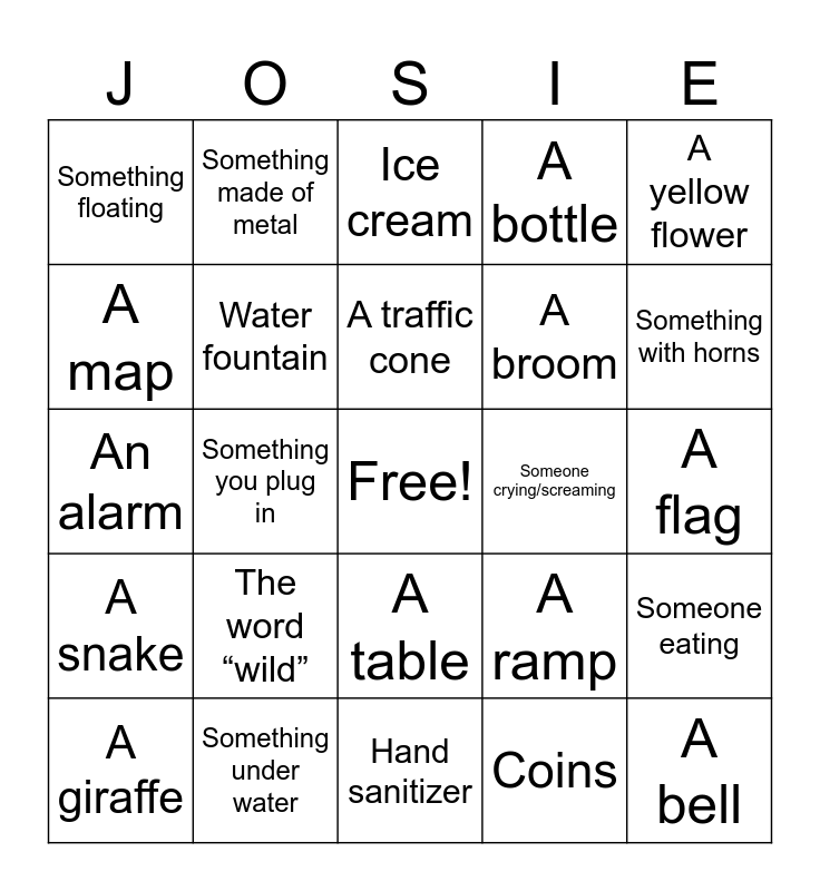 This bingo card has a free space and 61 words: Something stripped, Something under water, A lock, A snake, Coins, Flamingos, Water fountain, A sink, A broom, A stuffed animal, A bottle, A carousel, A map, A stranger with a beard, A stranger wearing sunglasses, Something floating, A bell, A yellow flower, A flower pot, A traffic cone, Someone crying/screaming, Ice cream, A giraffe, Someone eating, Something wet, Feathers, Something with a tail, Something with scales, Something with horns, Something you can fit in your pocket, A stranger wearing Sandals, A vending machine, A stranger wearing glasses, Something with wheels, Something made of metal, Something made of wood, Something cold, Something you plug in, A bench, An alarm, A bear, The word “wild”, A flag, Stairs, A ramp, A banner, Something with spots, Something with claws, Something that swims, A table, Hand sanitizer, String lights, A fence, A set of double doors, Something sticky, A leash, A hose, A stranger laughing, A do not enter sign, A pole and Something that folds.