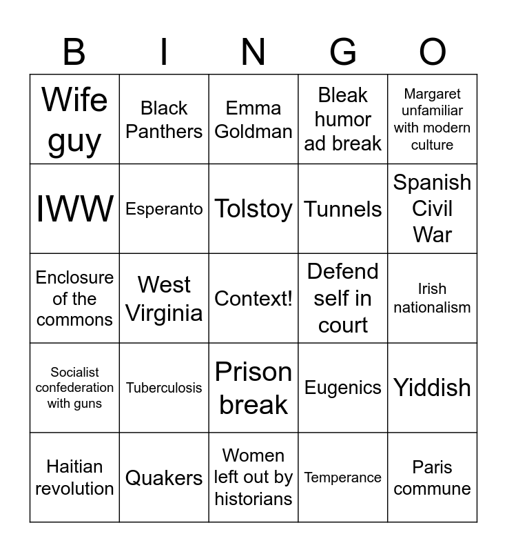 This bingo card has a free space and 24 words: Tuberculosis, Quakers, Tolstoy, Haitian revolution, Margaret unfamiliar with modern culture, Wife guy, IWW, Black Panthers, Defend self in court, Prison break, Tunnels, Enclosure of the commons, Eugenics, Yiddish, Esperanto, Temperance, Irish nationalism, Emma Goldman, Spanish Civil War, West Virginia, Paris commune, Socialist confederation with guns, Bleak humor ad break and Women left out by historians.