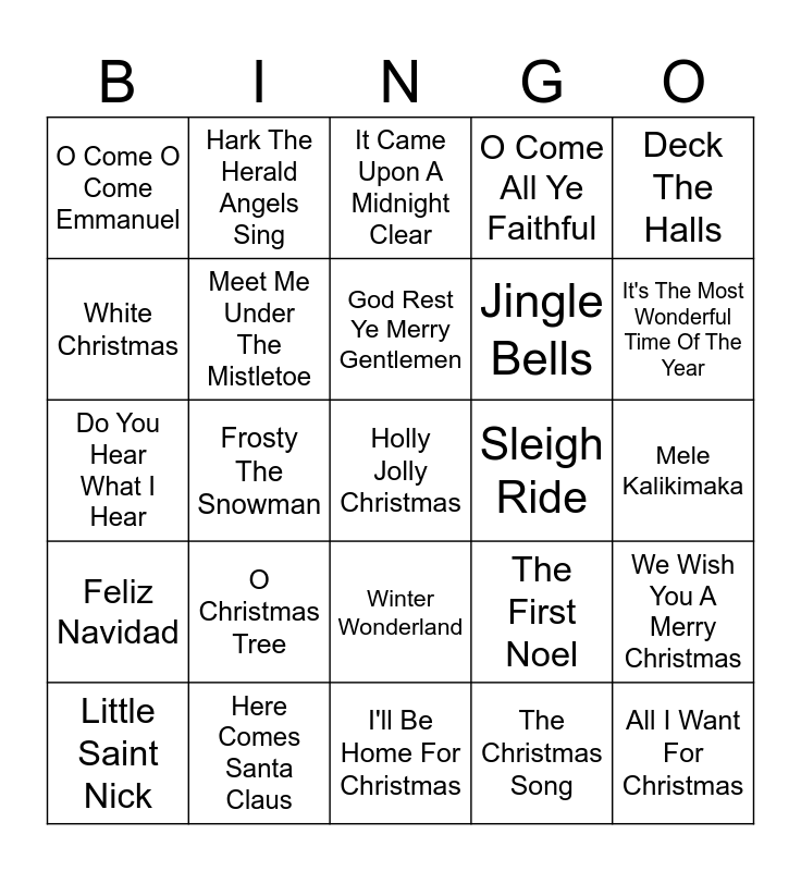 This bingo card has 61 words: Free!, Here Comes Santa Claus, Santa Baby, Feliz Navidad, The Christmas Song, It's Beginning To Look A Lot Like Christmas, Meet Me Under The Mistletoe, Rockin Around The Christmas Tree, Jingle Bells, Grandma Got Run Over By A Reindeer, O Come All Ye Faithful, Silent Night, White Christmas, Run Rudolph Run, Have Yourself A Merry Little Christmas, O Come O Come Emmanuel, Holly Jolly Christmas, Deck The Halls, Blue Chrstmas, God Rest Ye Merry Gentlemen, Sleigh Ride, It Came Upon A Midnight Clear, Little Saint Nick, We Wish You A Merry Christmas, The Night Before Christmas, I Want A Hippo For Christmas, Please Come Home For Christmas, Baby It's Cold Outside, It's The Most Wonderful Time Of The Year, Little Drummer Boy, What Child Is This, The Chipmunk Song, Santa Clause Is Coming To Town, Home For The Holidays, Hark The Herald Angels Sing, Merry Christmas Darling, Pretty Paper, Frosty The Snowman, I Saw Mommy Kissing Santa Claus, Do You Hear What I Hear, Merry Christmas Baby, O Christmas Tree, Mele Kalikimaka, Ol' Saint Nicholas, The First Noel, Let It Snow Let It Snow Let It Snow, Rudolph The Red-Nosed Reindeer, Silver Bells, Joy To The World, Winter Wonderland, I'll Be Home For Christmas, The Twelve Days Of Christmas, Auld Lang Syne, Jingle Bell Rock, Away In A Manger, We Three Kings, Mistletoe & Holly, Up On The Housetop, Christmas Cookies, All I Want For Christmas and O Little Town Of Bethlehem.