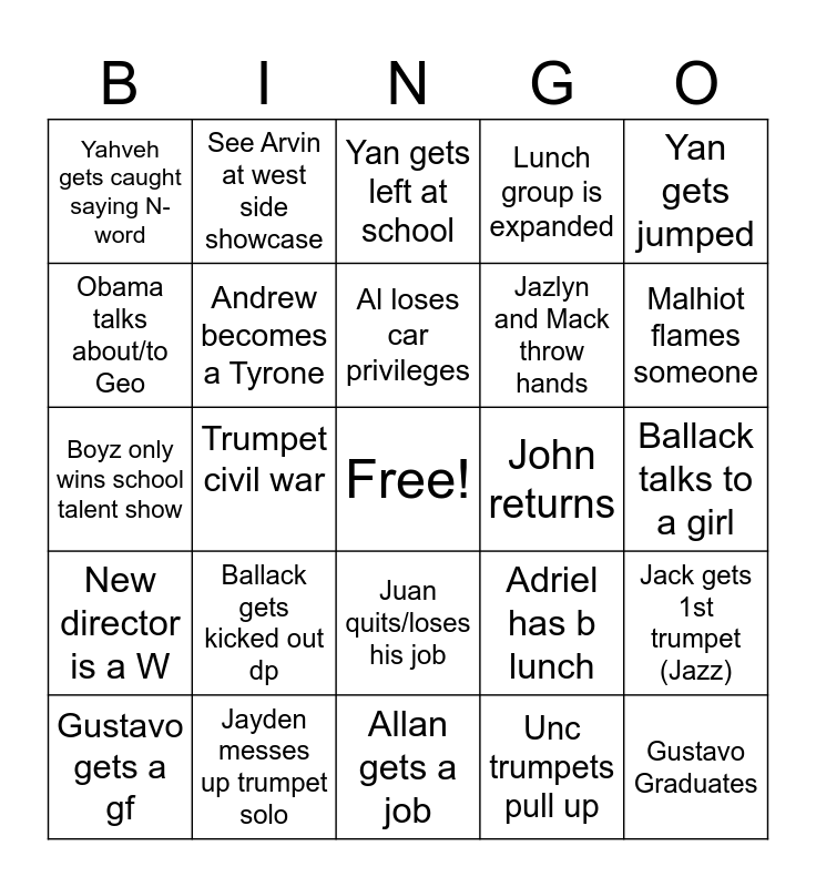 This bingo card has a free space and 24 words: Ballack gets kicked out dp, Jayden messes up trumpet solo, Al loses car privileges, Gustavo gets a gf, Yan gets jumped, Yahveh gets caught saying N-word, Obama talks about/to Geo, See Arvin at west side showcase, John returns, Juan quits/loses his job, Jazlyn and Mack throw hands, Boyz only wins school talent show, Adriel has b lunch, Jack gets 1st trumpet (Jazz), Andrew becomes a Tyrone, Unc trumpets pull up, Ballack talks to a girl, Yan gets left at school, Malhiot flames someone, Trumpet civil war, Gustavo Graduates, New director is a W, Lunch group is expanded and Allan gets a job.