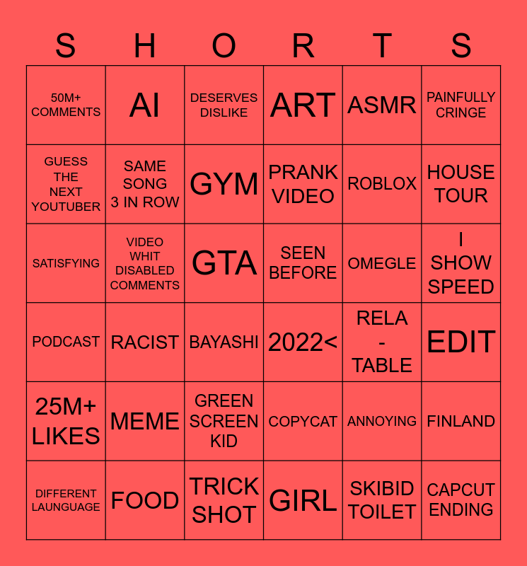 This bingo card has 36 words: PODCAST, RACIST, TRICK SHOT, PRANK VIDEO, OMEGLE, I SHOW SPEED, 50M+ COMMENTS, FOOD, DESERVES DISLIKE, COPYCAT, ROBLOX, PAINFULLY CRINGE, 25M+ LIKES, VIDEO WHIT DISABLED COMMENTS, GYM, ART, ANNOYING, EDIT, GUESS THE NEXT YOUTUBER, SAME SONG 3 IN ROW, BAYASHI, 2022<, RELA -TABLE, FINLAND, SATISFYING, AI, GTA, GIRL, ASMR, HOUSE TOUR, DIFFERENT LAUNGUAGE, MEME, GREEN SCREEN KID, SEEN BEFORE, SKIBID TOILET and CAPCUT ENDING.