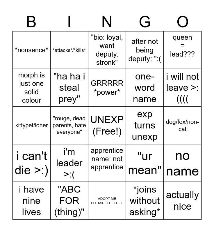 This bingo card has a free space and 24 words: i'm leader >:(, "ABC FOR (thing)", GRRRRR *power*, i have nine lives, queen = lead???, *nonsence*, morph is just one solid colour, *attacks*/*kills*, exp turns unexp, apprentice name: not apprentice, one-word name, kittypet/loner, "ur mean", no name, "ha ha i steal prey", *joins without asking*, dog/fox/non-cat, "bio: loyal, want deputy, stronk", i will not leave >:((((, "rouge, dead parents, hate everyone", actually nice, i can't die >:), after not being deputy: ":( and ADOPT ME PLEASEEEEEEEEE.
