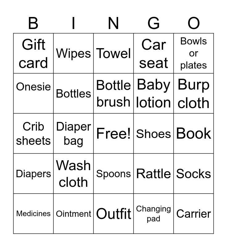 This bingo card has a free space and 27 words: Rattle, Toy, Baby lotion, Outfit, Onesie, Towel, Wipes, Diapers, Shoes, Socks, Crib sheets, Car seat, Medicines, Ointment, Burp cloth, Bath tub, Bottles, Bottle brush, Wash cloth, Gift card, Book, Changing pad, Diaper bag, Carrier, Spoons, Bowls or plates and Baby shampoo.
