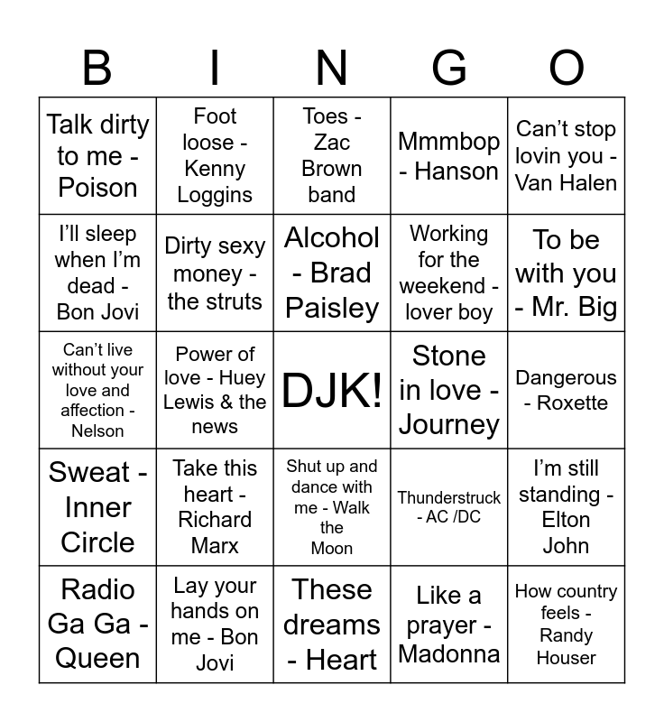 This bingo card has a free space and 44 words: Waiting for a star to fall - Boy meets girl, How country feels - Randy Houser, Fancy - Reba, Radio Ga Ga - Queen, Get outta my dreams, get into my car - Billy Ocean, Like a prayer - Madonna, Toes - Zac Brown band, Nothings gonna stop us now - Starship, Can’t stop lovin you - Van Halen, Lay your hands on me - Bon Jovi, Mmmbop - Hanson, Stone in love - Journey, Shut up and dance with me - Walk the Moon, Take this heart - Richard Marx, Every heart beat - Amy Grant, These dreams - Heart, Emotions - Mariah Carey, Can’t live without your love and affection - Nelson, Shake and tumble - Firehouse, To be with you - Mr. Big, Foot loose - Kenny Loggins, Sometimes - Britney Spears, That thing you do - The wonders, Talk dirty to me - Poison, Lil boo thang - Paul Russell, Dangerous - Roxette, All or nothing - O Town, Africa - Toto, Thunderstruck - AC /DC, Sweat - Inner Circle, Mas Tequila - Sammy Hagar, I’m still standing - Elton John, Never gonna give you up - Rick Astley, Something happened on the way to heaven - Phil Collins, Power of love - Huey Lewis & the news, Be my baby tonight - John Michael Montgomery, Do you Love me - The Contours, Rhythm of the night - Debarge, Alcohol - Brad Paisley, I’ll sleep when I’m dead - Bon Jovi, Working for the weekend - lover boy, Lonely is the night - Billy squier, Dirty sexy money - the struts and Roll with it - Steve winwood.