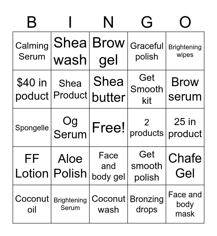 This bingo card has a free space and 24 words: Aloe Polish, Brightening Serum, Shea butter, Coconut oil, Brightening wipes, Calming Serum, $40 in poduct, Shea wash, 2 products, Face and body gel, Get Smooth kit, Spongelle, Get smooth polish, Chafe Gel, Shea Product, Bronzing drops, 25 in product, Brow gel, Brow serum, Og Serum, Face and body mask, FF Lotion, Graceful polish and Coconut wash.