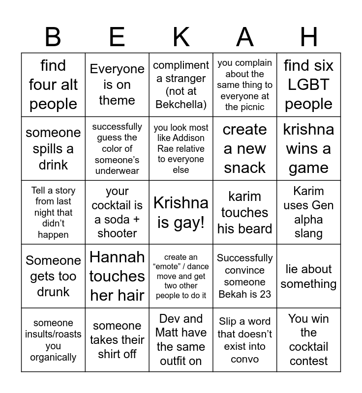 This bingo card has a free space and 24 words: Hannah touches her hair, someone takes their shirt off, you look most like Addison Rae relative to everyone else, someone insults/roasts you organically, find six LGBT people, find four alt people, someone spills a drink, Everyone is on theme, karim touches his beard, create an “emote” / dance move and get two other people to do it, create a new snack, Tell a story from last night that didn’t happen, Successfully convince someone Bekah is 23, lie about something, successfully guess the color of someone’s underwear, Slip a word that doesn’t exist into convo, Karim uses Gen alpha slang, compliment a stranger (not at Bekchella), krishna wins a game, your cocktail is a soda + shooter, You win the cocktail contest, Someone gets too drunk, you complain about the same thing to everyone at the picnic and Dev and Matt have the same outfit on.