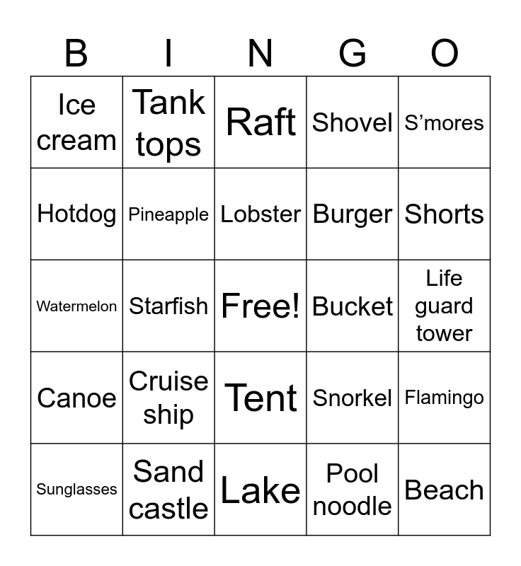 This bingo card has a free space and 43 words: Umbrella, Beach, chair, Sunglasses, Swimsuit, Pool noodle, Raft, Bonfire, S’mores, Sand castle, Shovel, Bucket, Tent, Cruise ship, Island, Lake, Water slides, Watermelon, Flip flops, Shorts, Tank tops, Fireworks, Lemonade, Ice cream, Popsicle, Life guard tower, Grill, Swim flippers, Snorkel, Canoe, Surfboard, Flamingo, Seashell, Starfish, Sanddollar, Picnic Basket, Crab, Lobster, Hotdog, Burger, Sun, Pineapple and Beach Towel.