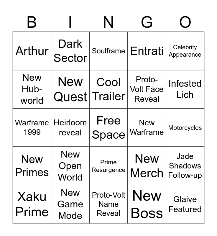 This bingo card has a free space and 24 words: New Open World, New Game Mode, Cool Trailer, Xaku Prime, Celebrity Appearance, Arthur, New Hub-world, Dark Sector, New Warframe, Prime Resurgence, Proto-Volt Face Reveal, Warframe 1999, New Merch, Jade Shadows Follow-up, New Quest, New Boss, Motorcycles, Soulframe, Infested Lich, Heirloom reveal, Glaive Featured, New Primes, Entrati and Proto-Volt Name Reveal.
