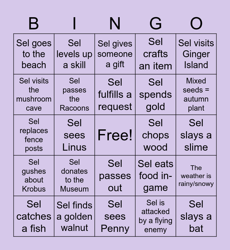 This bingo card has a free space and 31 words: Sel sees Penny, Sel sees Elliot, Sel sees Linus, Sel sees Robin, Sel goes to the beach, Sel gives someone a gift, Sel passes the Racoons, Sel eats food in-game, Sel chops wood, Sel is attacked by a flying enemy, Sel slays a slime, Sel slays a bat, Mixed seeds = spring plant, Mixed seeds = summer plant, Mixed seeds = autumn plant, Mixed seeds = winter plant, The weather is rainy/snowy, Sel donates to the Museum, Sel gushes about Krobus, Sel passes out, Sel visits Ginger Island, Sel mines a gemstone, Sel catches a fish, Sel levels up a skill, Sel spends gold, Sel visits the mushroom cave, Sel crafts an item, Sel replaces fence posts, Sel finds a golden walnut, Sel fulfills a request and Sel goes to a holiday event.