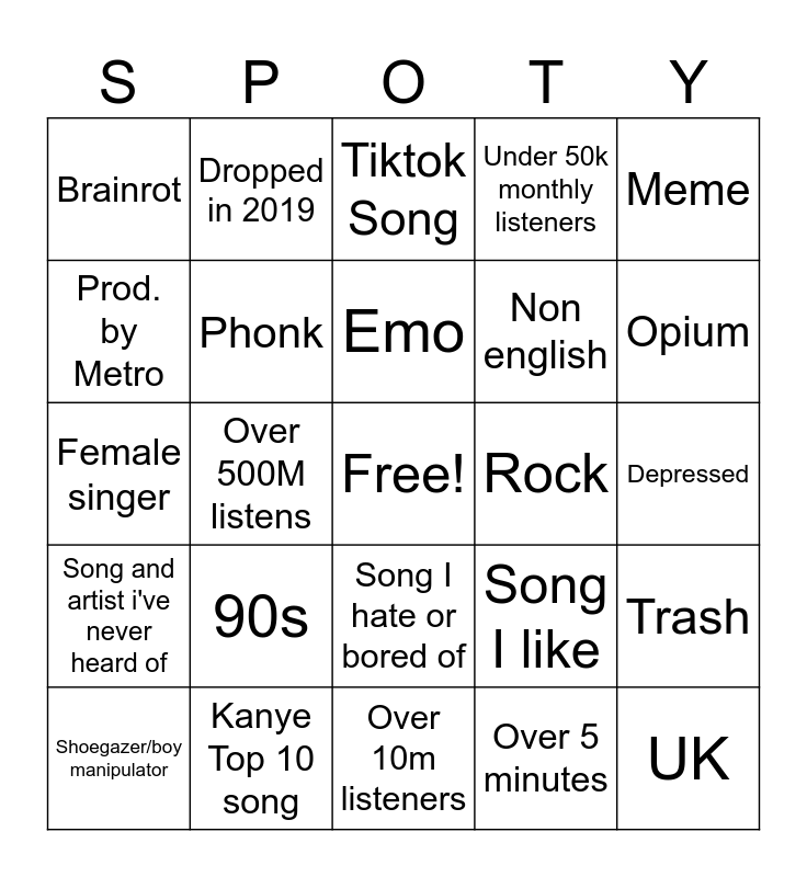 This bingo card has a free space and 24 words: 90s, Kanye Top 10 song, Emo, Shoegazer/boy manipulator, Meme, Brainrot, Prod. by Metro, Dropped in 2019, Rock, Song I hate or bored of, Non english, Female singer, Song I like, Trash, Phonk, Over 5 minutes, Depressed, Tiktok Song, Opium, Over 500M listens, UK, Song and artist i've never heard of, Under 50k monthly listeners and Over 10m listeners.