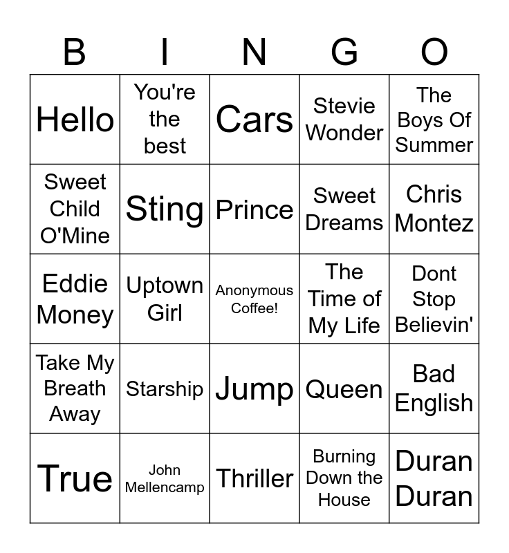 This bingo card has a free space and 39 words: UB40, Karma Chameleon, Never Gonna Give You Up, Sting, True, Jump, Prince, Papa Dont Preach, The Boys Of Summer, Take My Breath Away, Uptown Girl, Stevie Wonder, Duran Duran, Dont Stop Believin', The Time of My Life, Starship, Wake Me Up Before You Go-Go, Hello, Fast Car, Queen, Sweet Child O'Mine, Thriller, Sweet Dreams, Chris Montez, I Wanna Dance with Somebody, You Got it, Europe, Eye of the Tiger, Bon Jovi, You're the best, I'm free, Pat Benatar, Cars, John Mellencamp, Burning Down the House, Jessies Girl, Bad English, Eddie Money and All She Wants To DO is Dance.