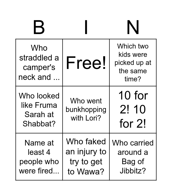This bingo card has 12 words: She knew! She knew!, Who carried around a Bag of Jibbitz?, Who went bunkhopping with Lori?, 10 for 2! 10 for 2!, Free!, Which two kids were picked up at the same time?, Who faked an injury to try to get to Wawa?, Whose behavior was likely the result of the full moon?, Who straddled a camper's neck and ..., Who looked like Fruma Sarah at Shabbat?, Name at least 4 people who were fired... and Who never got out of bed in Avodah ....