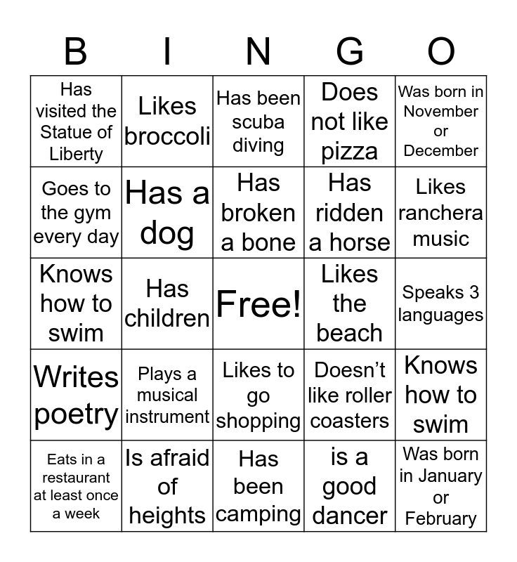 This bingo card has a free space and 24 words: Plays a musical instrument, Is afraid of heights, Has broken a bone, Eats in a restaurant at least once a week, Was born in November or December, Has visited the Statue of Liberty, Goes to the gym every day, Likes broccoli, Likes the beach, Likes to go shopping, Has ridden a horse, Knows how to swim, Doesn’t like roller coasters, Knows how to swim, Has a dog, is a good dancer, Speaks 3 languages, Has been scuba diving, Likes ranchera music, Has children, Was born in January or February, Writes poetry, Does not like pizza and Has been camping.