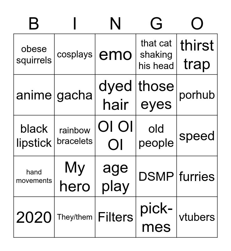 This bingo card has a free space and 24 words: My hero, They/them, dyed hair, 2020, thirst trap, obese squirrels, anime, cosplays, old people, age play, those eyes, black lipstick, DSMP, furries, gacha, pick-mes, speed, emo, porhub, rainbow bracelets, vtubers, hand movements, that cat shaking his head and Filters.