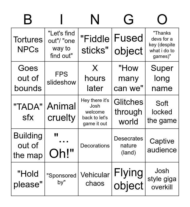 This bingo card has a free space and 53 words: Game crashes, Josh style giga overkill, "You don't need to tell me twice", Flying object, "... Oh!", Accidental chaos, "Let's find out"/ "one way to find out", Grace enters the chat, Goes out of bounds, Ragdoll physics, FPS slideshow, Cheeses the game, Captive audience, Desecrates nature (land), Psychological warfare, "Hold please", X hours later, Glitches through world, "Is there a limit?", "Thanks devs for a key (despite what i do to games)", Animal cruelty, "He's fine", "How many can we", Tortures NPCs, Josh dies, "Sponsored by", Explosives, Character creation nightmare, Degrading name for person/ place/ thing, Super long name, Super long windy path/ maze, NPC abomination, Crimes against humanity, Talking to deadpan NPC, Exploits NPC AI, Extreme topography, Fused object, Vehicular chaos, "Fiddle sticks", Game rejects Josh's shenanigans, "New game!", Ignores exposition/ tutorial, Soft locked the game, Physics defying construction, F**k you in particular (Josh singles out an NPC to torture), Decorations, Josh plays the game right for some reason, "Dont know what I expected", "TADA" sfx, Building out of the map, "Ugh, fine!" (Forced to play as intended), Dead body and I guess I could (do something intended by the devs), but....