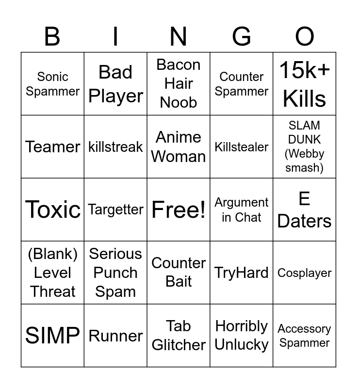 This bingo card has a free space and 24 words: Serious Punch Spam, Runner, Anime Woman, SIMP, 15k+ Kills, Sonic Spammer, Teamer, Bad Player, Argument in Chat, Counter Bait, Killstealer, Toxic, TryHard, Cosplayer, killstreak, Horribly Unlucky, E Daters, Bacon Hair Noob, SLAM DUNK (Webby smash), Targetter, Accessory Spammer, (Blank) Level Threat, Counter Spammer and Tab Glitcher.