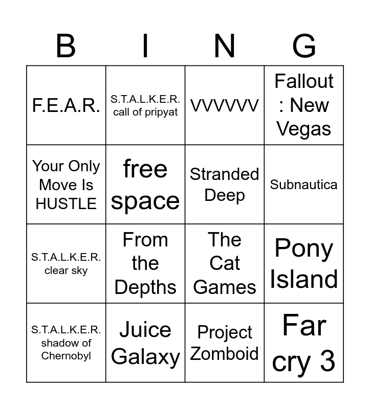 This bingo card has 16 words: S.T.A.L.K.E.R. shadow of Chernobyl, Juice Galaxy, VVVVVV, Fallout : New Vegas, Your Only Move Is HUSTLE, S.T.A.L.K.E.R. call of pripyat, The Cat Games, Pony Island, F.E.A.R., free space, Project Zomboid, Subnautica, S.T.A.L.K.E.R. clear sky, From the Depths, Stranded Deep and Far cry 3.