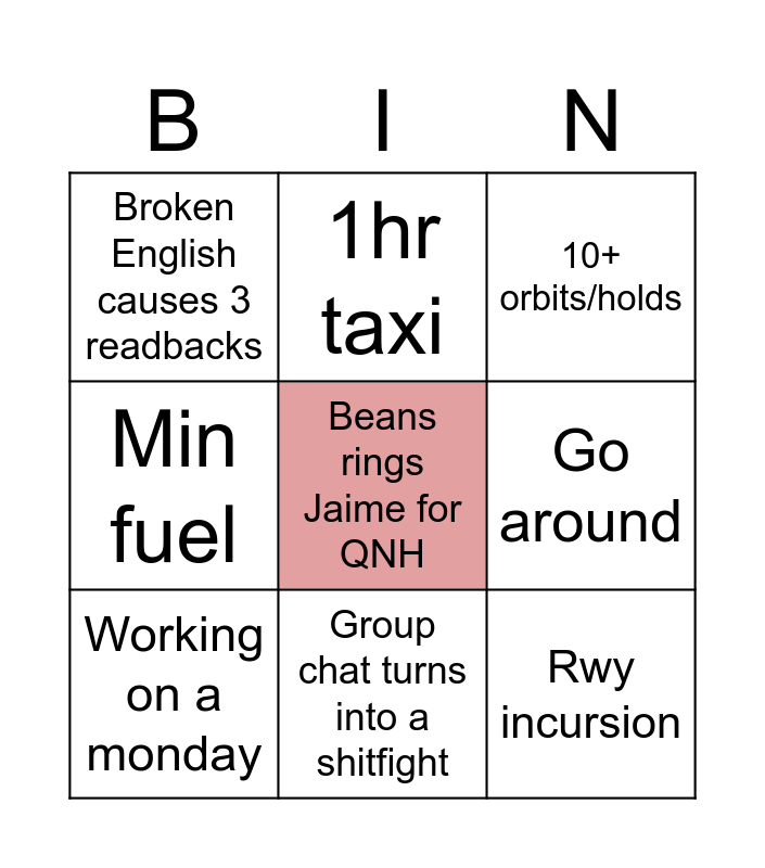 This bingo card has a free space and 8 words: Go around, 10+ orbits/holds, 1hr taxi, Working on a monday, Broken English causes 3 readbacks, Rwy incursion, Min fuel and Group chat turns into a shitfight.