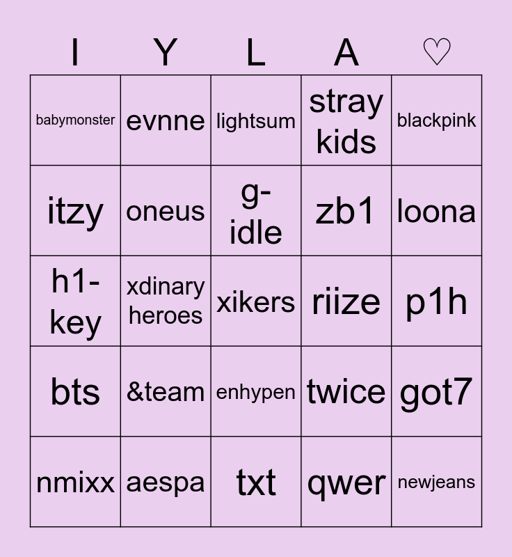 This bingo card has a free space and 54 words: illit, bts, exo, shinee, enhypen, monsta x, stray kids, cherry bullet, itzy, stayc, babymonster, nct, aespa, nmixx, onlyoneof, txt, newjeans, zb1, nct127, p1h, twice, bnd, riize, blackpink, lsfm, evnne, ateez, triples, unis, qwer, nomad, gfriend, viviz, snsd, lightsum, cignature, h1-key, got7, vcha, oneus, day6, everglow, tws, lapillus, &team, dreamnote, kard, misamo, g-idle, xdinary heroes, loona, iz*one, 8turn and svt.
