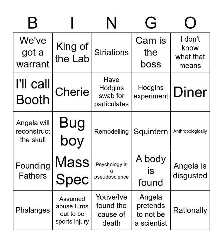 This bingo card has 25 words: Mass Spec, Youve/Ive found the cause of death, Have Hodgins swab for particulates, Phalanges, I don't know what that means, We've got a warrant, I'll call Booth, King of the Lab, Squintern, Psychology is a pseudoscience, Hodgins experiment, Angela will reconstruct the skull, A body is found, Angela is disgusted, Cherie, Rationally, Anthropologically, Striations, Diner, Bug boy, Remodelling, Assumed abuse turns out to be sports injury, Founding Fathers, Cam is the boss and Angela pretends to not be a scientist.