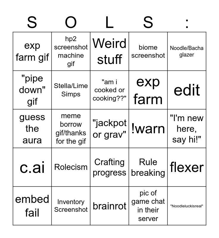 This bingo card has a free space and 24 words: Rolecism, Inventory Screenshot, "am i cooked or cooking??", embed fail, Noodle/Bacha glazer, exp farm gif, "pipe down" gif, hp2 screenshot machine gif, !warn, Crafting progress, exp farm, guess the aura, Rule breaking, flexer, Stella/Lime Simps, pic of game chat in their server, "I'm new here, say hi!", Weird stuff, edit, meme borrow gif/thanks for the gif, "Noodleluckisreal", c.ai, biome screenshot and brainrot.