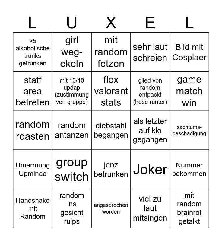 This bingo card has 25 words: group switch, angesprochen worden, flex valorant stats, Handshake mit Random, Bild mit Cosplaer, >5 alkoholische trunks getrunken, staff area betreten, girl weg-ekeln, als letzter auf klo gegangen, jenz betrunken, glied von random entpackt (hose runter), random roasten, Joker, Nummer bekommen, mit 10/10 updap (zustimmung von gruppe), mit random brainrot getalkt, sachtums- beschadigung, mit random fetzen, game match win, random antanzen, diebstahl begangen, random ins gesicht rulps, Umarmung Upminaa, sehr laut schreien and viel zu laut mitsingen.