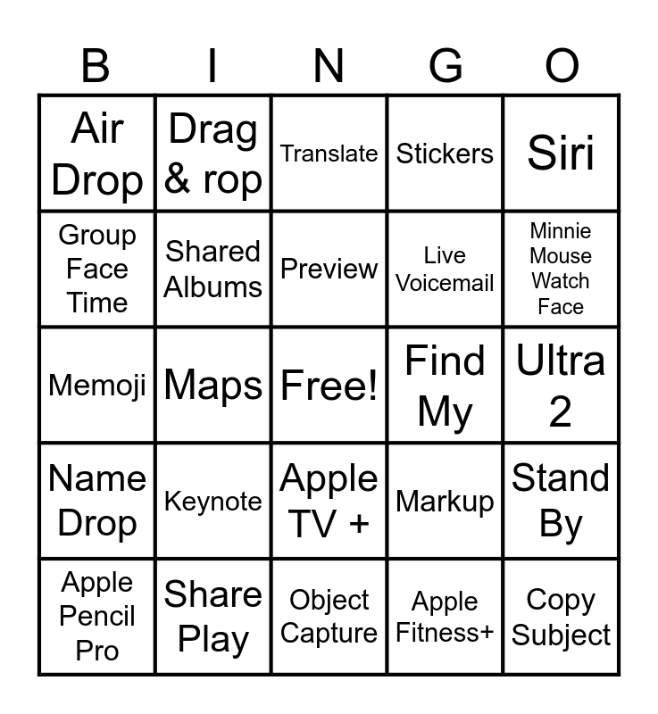 This bingo card has a free space and 24 words: Keynote, Share Play, Preview, Apple Pencil Pro, Siri, Air Drop, Group Face Time, Drag & rop, Find My, Apple TV +, Live Voicemail, Memoji, Markup, Stand By, Shared Albums, Apple Fitness+, Ultra 2, Translate, Minnie Mouse Watch Face, Maps, Copy Subject, Name Drop, Stickers and Object Capture.