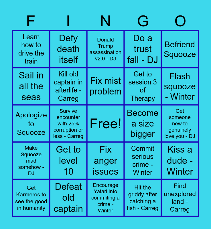 This bingo card has a free space and 24 words: Get to level 10, Defeat old captain, Fix mist problem, Get Karmeros to see the good in humanity, Befriend Squooze, Learn how to drive the train, Sail in all the seas, Defy death itself, Become a size bigger, Fix anger issues, Get to session 3 of Therapy, Apologize to Squooze, Commit serious crime - Winter, Kiss a dude - Winter, Kill old captain in afterlife - Carreg, Hit the griddy after catching a fish - Carreg, Get someone new to genuinely love you - DJ, Donald Trump assassination v2.0 - DJ, Flash squooze - Winter, Survive encounter with 25% corruption or less - Carreg, Find unexplored land - Carreg, Make Squooze mad somehow - DJ, Do a trust fall - DJ and Encourage Yatari into commiting a crime - Winter.