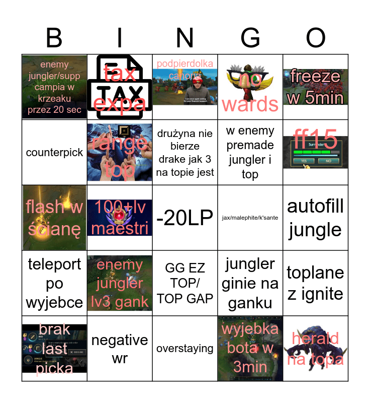 This bingo card has 13 images, a free space and 24 words: brak last picka, enemy jungler lv3 gank, drużyna nie bierze drake jak 3 na topie jest, wyjebka bota w 3min, freeze w 5min, enemy jungler/supp campia w krzeaku przez 20 sec, tax expa, podpierdolka canona, jax/malephite/k'sante, autofill jungle, flash w ścianę, range top, jungler ginie na ganku, toplane z ignite, counterpick, negative wr, overstaying, no wards, ff15, teleport po wyjebce, 100+lv maestri, GG EZ TOP/ TOP GAP, w enemy premade jungler i top and herald na topa.