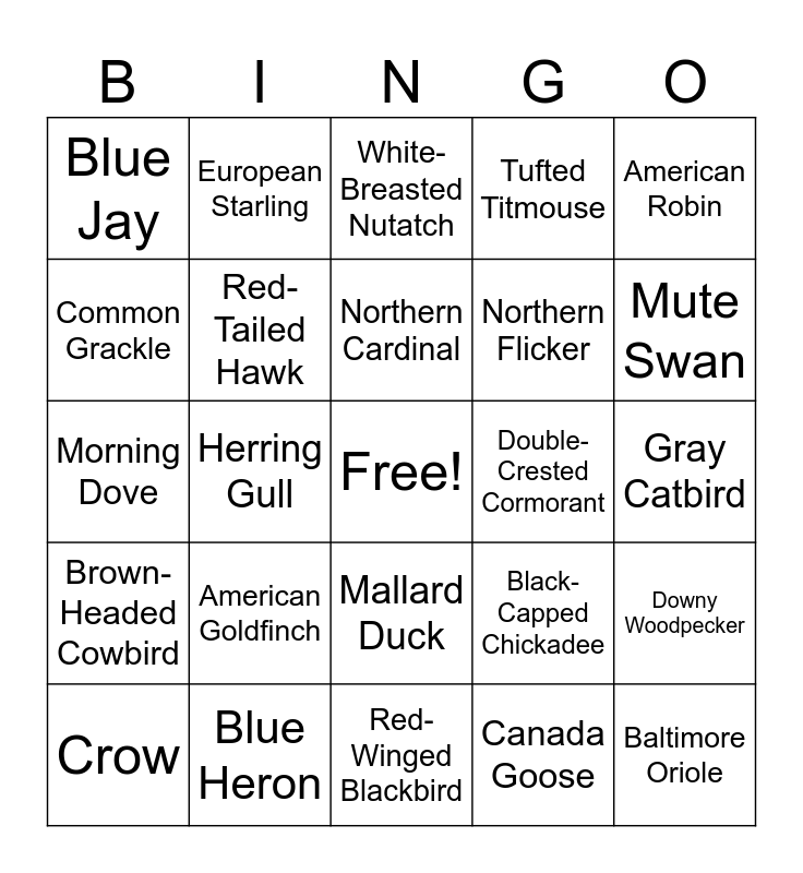 This bingo card has a free space and 26 words: Mallard Duck, Canada Goose, Northern Cardinal, Blue Heron, American Robin, Blue Jay, Common Grackle, European Starling, Gray Catbird, Black-Capped Chickadee, Northern Flicker, Morning Dove, Downy Woodpecker, Crow, Herring Gull, Eastern Kingbird, Tufted Titmouse, Brown-Headed Cowbird, White-Breasted Nutatch, Baltimore Oriole, Mute Swan, Red-Winged Blackbird, Double-Crested Cormorant, American Goldfinch, Red-Tailed Hawk and Hooded Merganser.