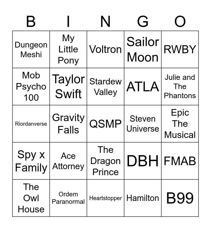 This bingo card has a free space and 24 words: Ace Attorney, Ordem Paranormal, Stardew Valley, The Owl House, RWBY, Dungeon Meshi, Mob Psycho 100, My Little Pony, Steven Universe, The Dragon Prince, ATLA, Riordanverse, DBH, FMAB, Taylor Swift, Hamilton, Epic The Musical, Voltron, Julie and The Phantons, Gravity Falls, B99, Spy x Family, Sailor Moon and Heartstopper.