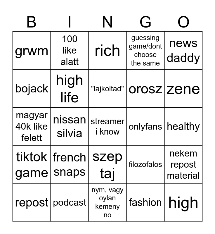 This bingo card has 25 words: french snaps, nym, vagy oylan kemeny no, "lajkoltad", repost, news daddy, grwm, bojack, 100 like alatt, onlyfans, szep taj, orosz, magyar 40k like felett, filozofalos, nekem repost material, high life, high, healthy, rich, zene, nissan silvia, streamer i know, podcast, tiktok game, guessing game/dont choose the same and fashion.